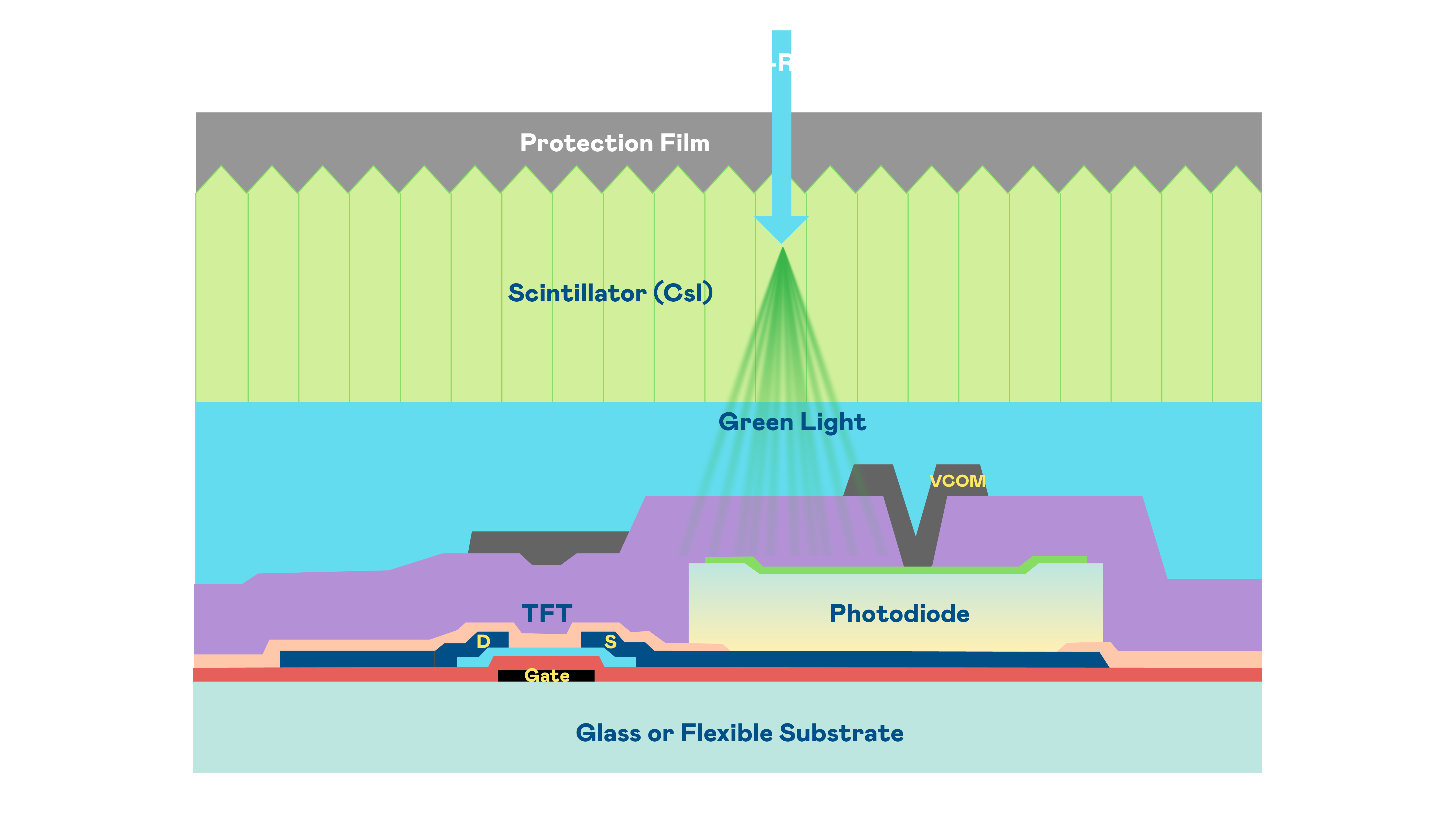 mg冰球突破的X光影像感测阵列使用薄膜电晶体 (TFT) 作为每个像素的读取开关,搭配光电二极体(Photodiode)的光电转换元件,用以感测X光影像讯号。
